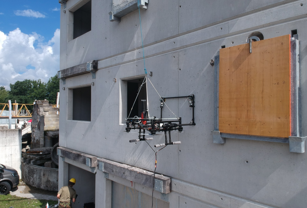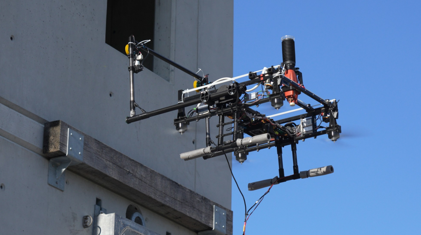 下一步才是真正的亮点:将四个转子连接到旋转臂上。这样,如果需要的话,它们可以倾斜 90 度,这意味着转子不再产生升力,而是将整个结构压向墙壁。其压力高达 150 牛顿,足以完成各种施工任务。直径达 10 毫米的孔已经钻好,但还可以钻出更大的孔。