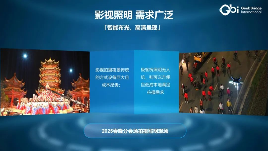 极客桥无人机以低成本的方式实现了智能布光,为影视拍摄带来了全新的体验。在《2025春晚》等大型节目中,极客桥无人机凭借其灵活多变的布光效果,成功助力完成了精美的夜景拍摄,为观众呈现出了一场视觉盛宴。