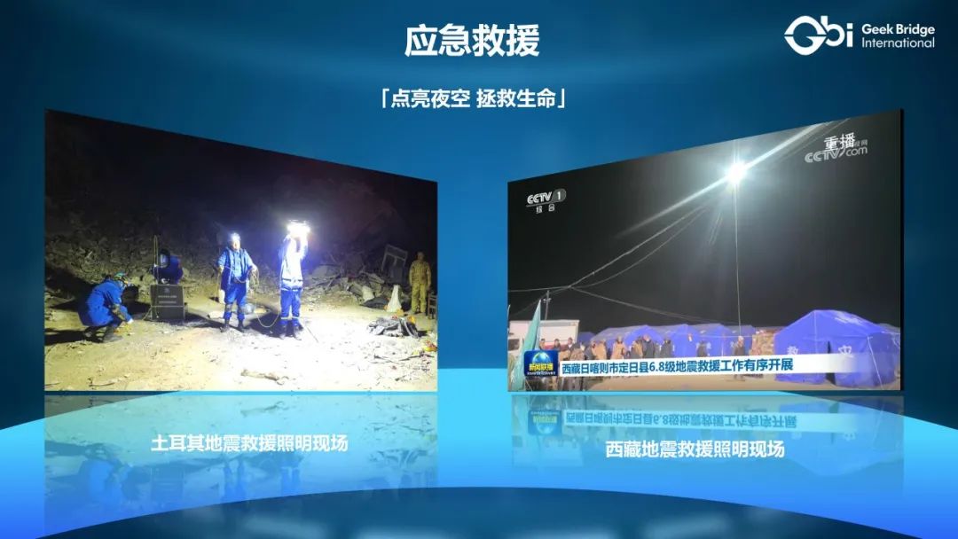在土耳其地震、西藏地震等重大灾难现场,极客桥照明无人机总是能迅速响应,第一时间部署到救援一线。在黑暗的夜晚,它就像一盏盏明亮的希望之灯,为夜间搜救工作提供了全天候的照明支持。其高亮度、广覆盖的特性,让救援人员能够清晰地看到每一个角落,大幅提升了救援效率,成为“拯救生命”的关键装备。许多被困人员因为极客桥无人机的照明而被及时发现并获救,它真正点亮了生命之光。