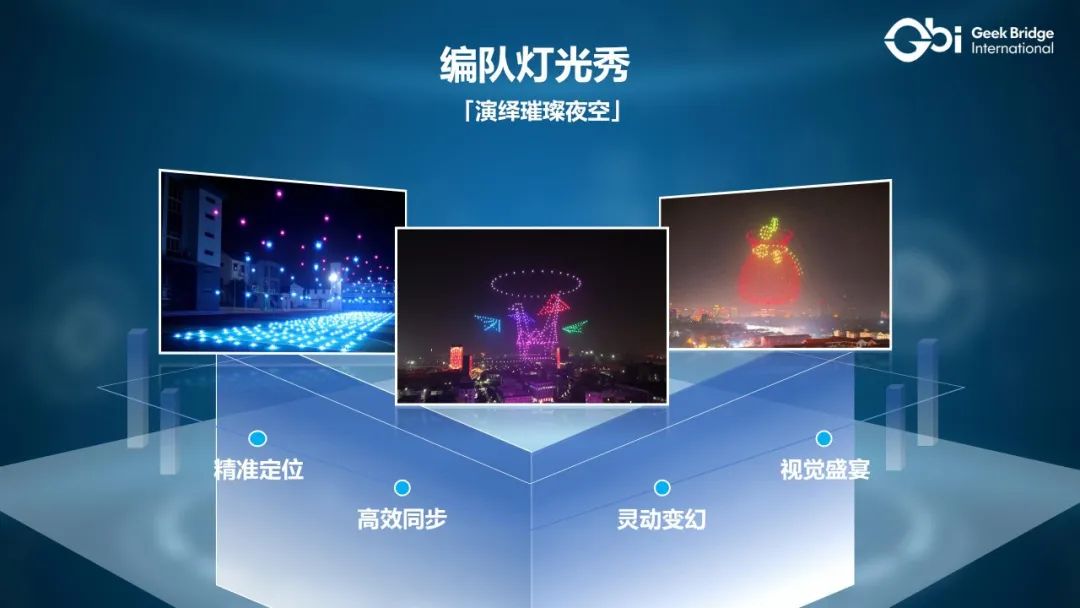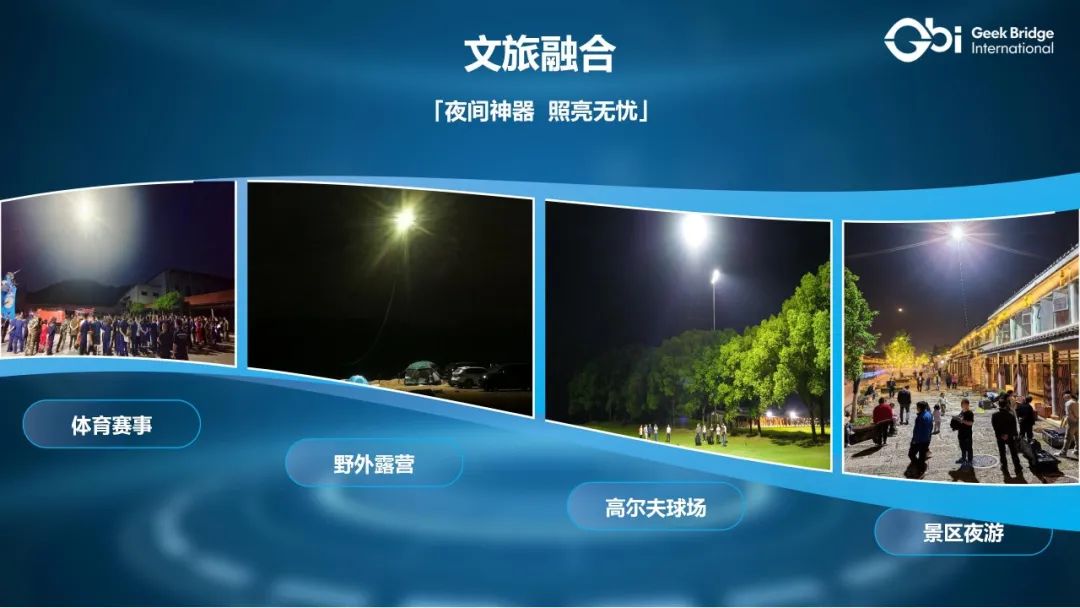 从景区夜游、高尔夫球场照明到野外露营灯光保障,极客桥的照明无人机成为了人们口中的“夜间神器”。它不仅为这些活动提供了充足的照明,还通过其独特的设计和功能,为用户带来了全新的夜间体验。此外,极客桥无人机的编队灯光秀功能更是以动态光影演绎夜空艺术,为文旅产业注入了新的活力。在一些景区,极客桥无人机的编队灯光秀吸引了大量游客,成为了当地的一道亮丽风景线,有力地推动了文旅产业的升级。