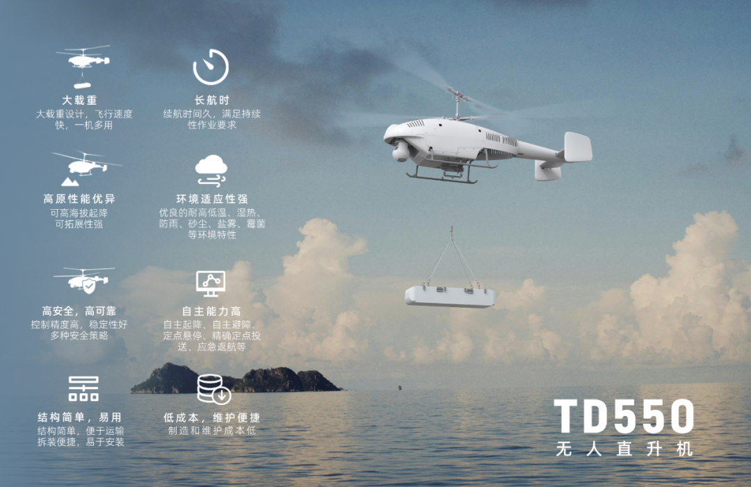 联合飞机的TD550运输投送无人机系统由无人机主体、运输系统和导航控制系统组成,具备多项技术优势,确保高效、安全的运投作业。