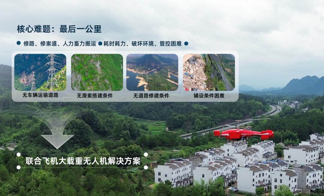 在电力基础设施建设与运维中,传统运输方式面临着诸多挑战。复杂地形难以进入,运输道路修建成本高昂,人背马驮和索道运输方式存在运距长、运量小、耗时长、作业环境差等问题,工人与马匹面临跌落风险,且开辟运输道路会造成植被损坏,无法实现高效、环保运输。联合飞机针对这些痛点,提出大载重运投无人机解决方案,旨在通过无人系统的创新应用,提升电力基础设施建设与运维的效率与安全性,同时降低综合成本。