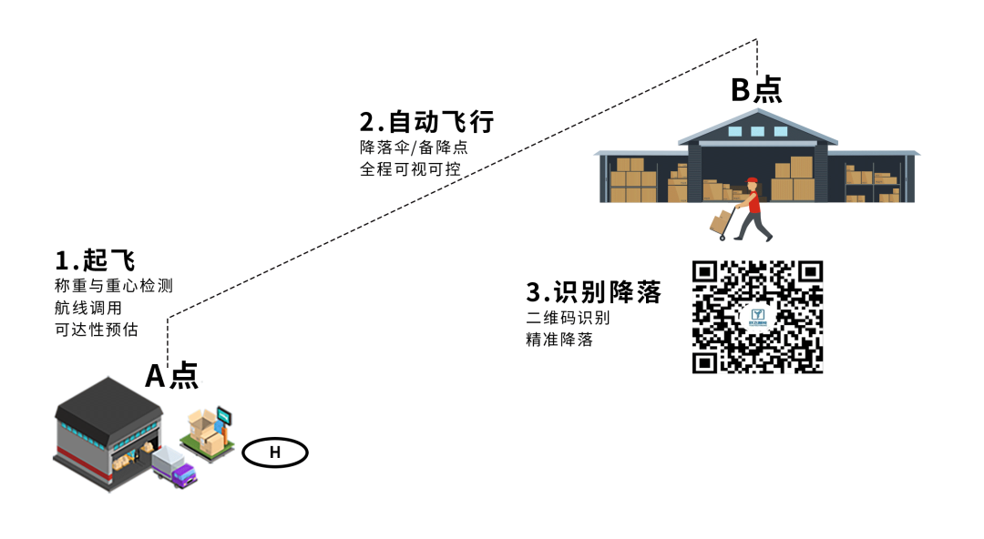 无人机日常飞行主要选用常态化运输航线为主, 实现点对点飞行,中间不做停留;如遇到临时任务需求可以规划临时航线进行作业,但应确保航线飞行安全;人工操控飞行仅在应急情况下,由具有飞行资质的人员进行操控飞行。无人机技术通过精确规划 AB 点间的固定航线并保存于系统以便快速调用,实现了从 A 点到 B 点的高效起降运输。在 A 点,货物经过精确称重与适配装载后,综合考虑飞行条件确保安全,无人机在全面起飞前检查无误后自动起飞。飞行过程中,实时监控与管理确保无人机按预设航线安全飞行,至 B 点时通过识别专属二维码实现精准自动降落。任务完成后,无人机自动返航至 A 点,整个过程中地面控制中心持续监控,确保无人机运输的安全、高效与灵活性,为物流行业带来了显著的效率提升与成本优化。