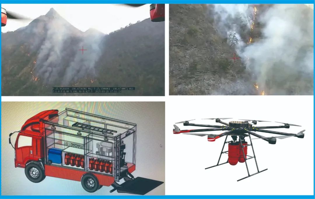 2025年4月5日,某高原地区突发森林火情,因地形复杂山势陡峭,传统灭火方式难以快速响应且存在救援人员的安全问题。正在当地执行其他任务的深圳市科卫泰实业发展有限公司接到支援请求后,紧急调派一辆简易型无人机灭火车,携带1架50kg、2架30kg载重灭火无人机及1架侦察无人机,通过 “空中精准投弹 + 地面协同” 模式,历经30余架次作业,仅用一天时间成功控制火势,扑灭时间较传统方式大幅度缩短。