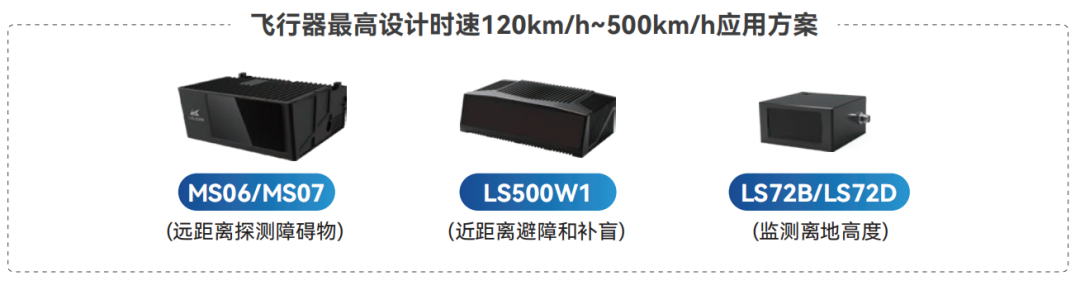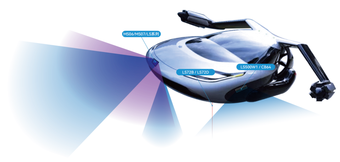 • 前向配置LS-S3/S2系列图像级车规光纤激光雷达,最远探测距离500米,可实时探测识别前向入侵障碍物,灵活应对复杂城市低空环境。