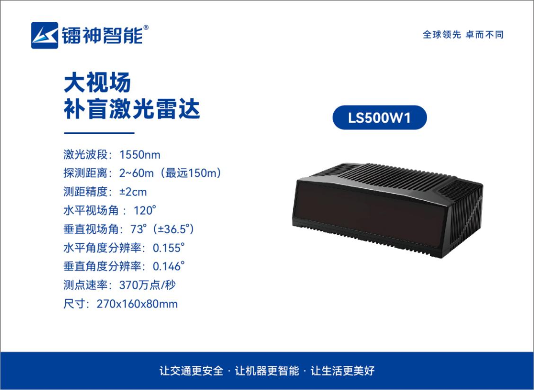 • 侧向搭载LS500W1超广角补盲激光雷达,探测角度120°x73°,可大范围感知探测侧向入侵障碍物。