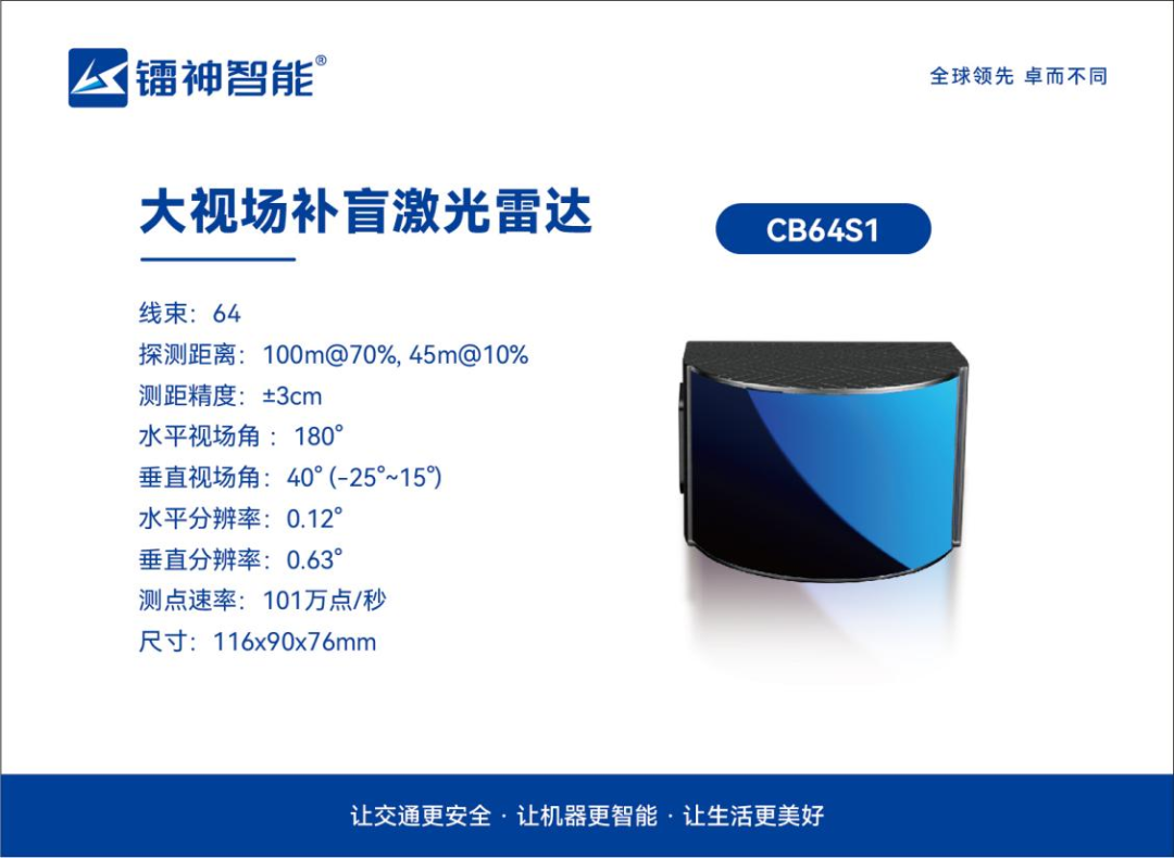 • 侧向搭载CB64超广角补盲激光雷达,探测角度180°x40°,可大范围感知探测侧向入侵障碍物。