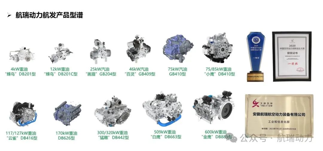 以DB416为基础,航瑞动力不断丰富批量化产品型谱,已陆续批量化交付300kW级DB442型“猛雕”重油机、80kW级DB410型“小鹰”重油机、40kW级GB409型“百灵”汽油机,覆盖更多飞机型号,将在更多应用场景看到航瑞发动机勤恳工作的身影。