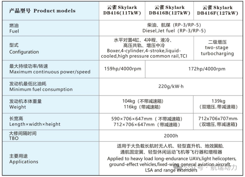 “云雀”DB416重油航空发动机有三个版本,分别为117kW标准版、127kW高性能版、127kW高海拔版。