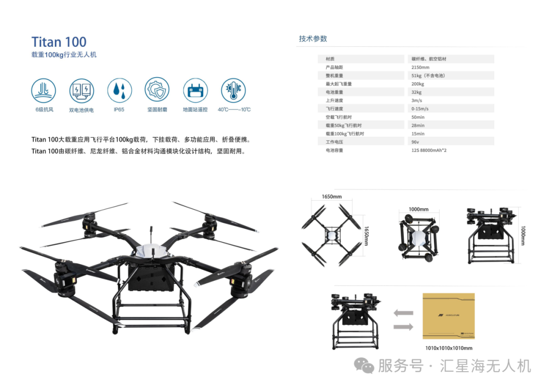 汇星海全新升级的--Titan行业无人机,以100kg超大载重、模块化设计、超长续航等硬核性能,重新定义行业运输标准!