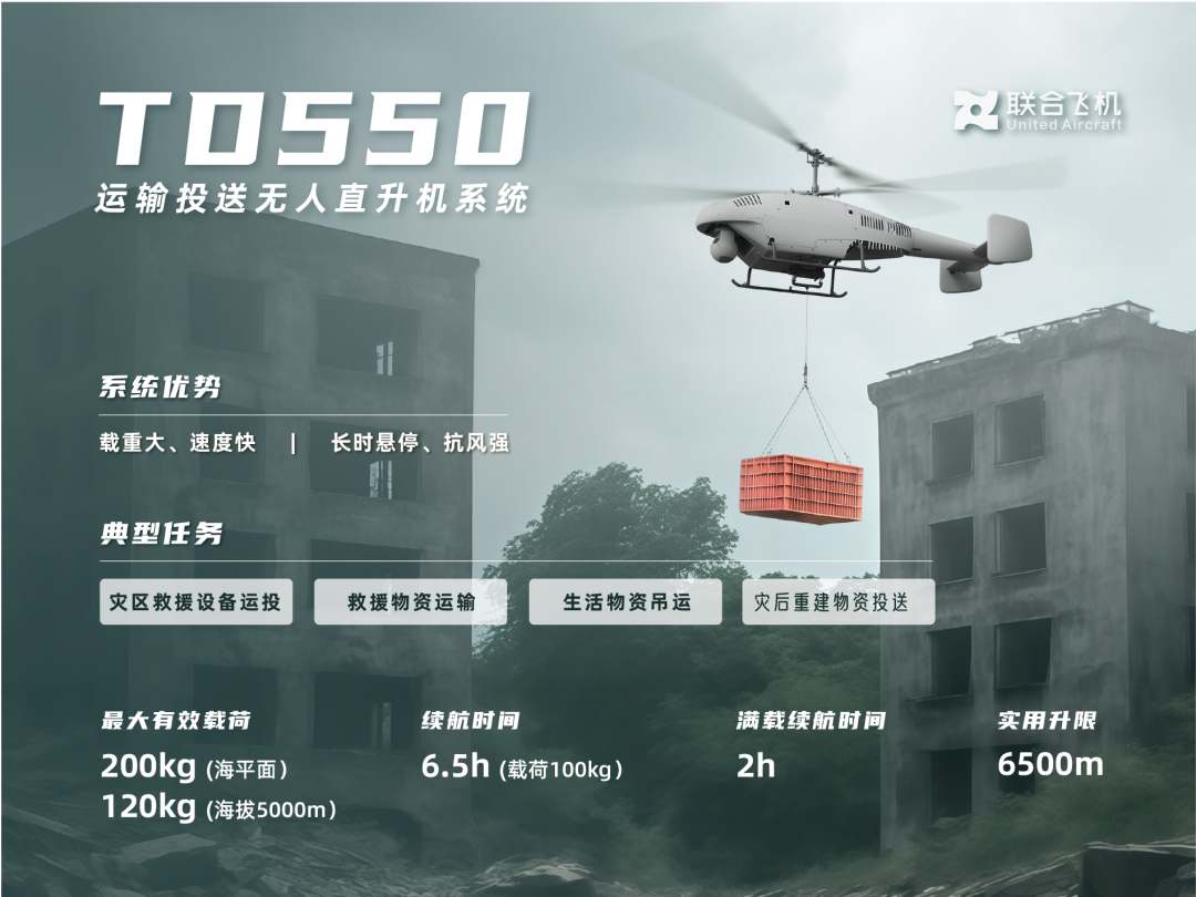 大载重无人直升机TD550凭借其强大的载重能力和长航时性能,衍生应急通信、消防灭火、救援运投三大构型,实现复杂场景的“一机多能”。