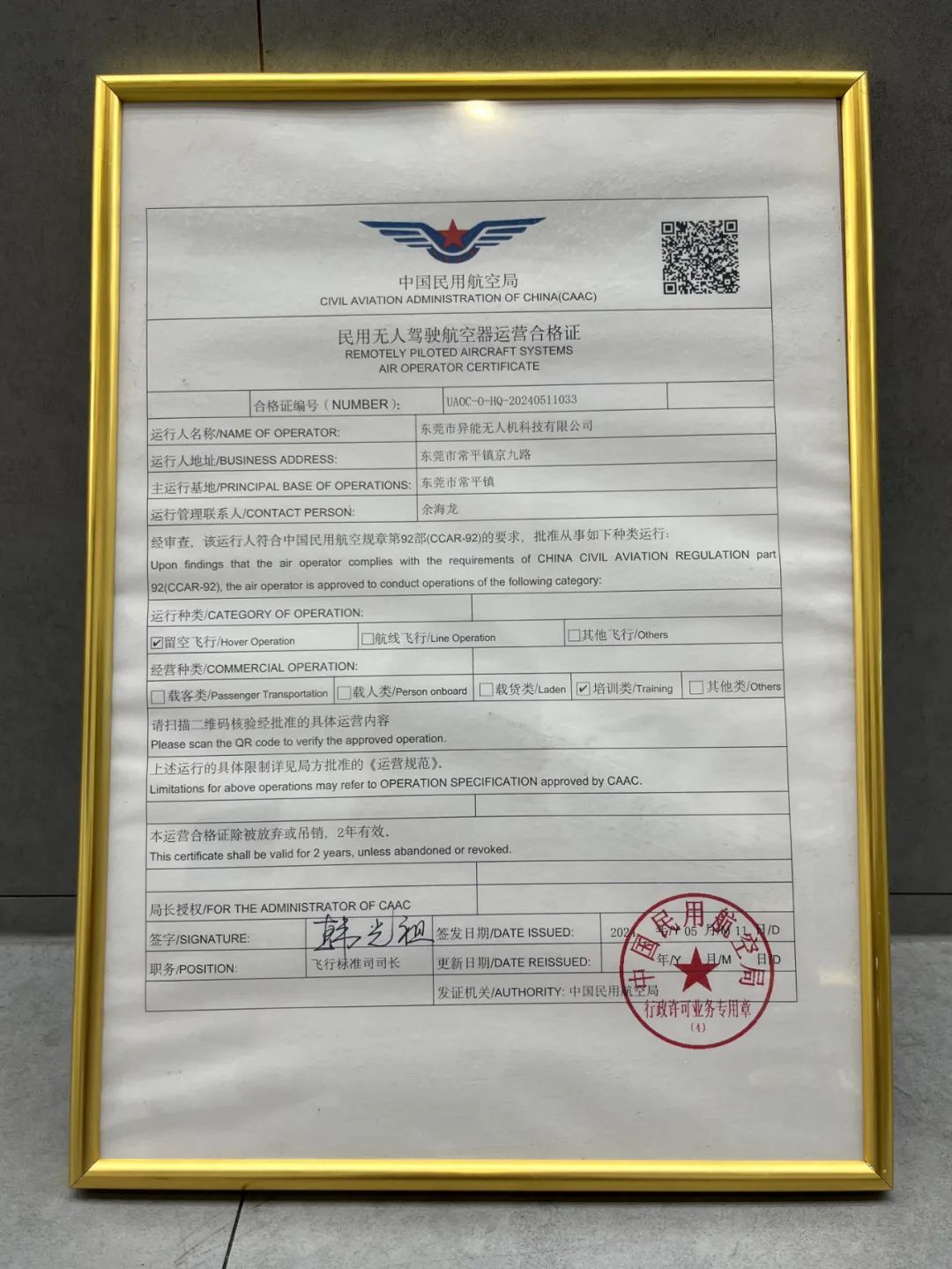 2016年华越无人机授权为东莞分校;公司拥有3万平方米飞行基地和强大的师资团队,是全国首批,广东第一家ALPA审定合格的训练机构,华南区考试中心。