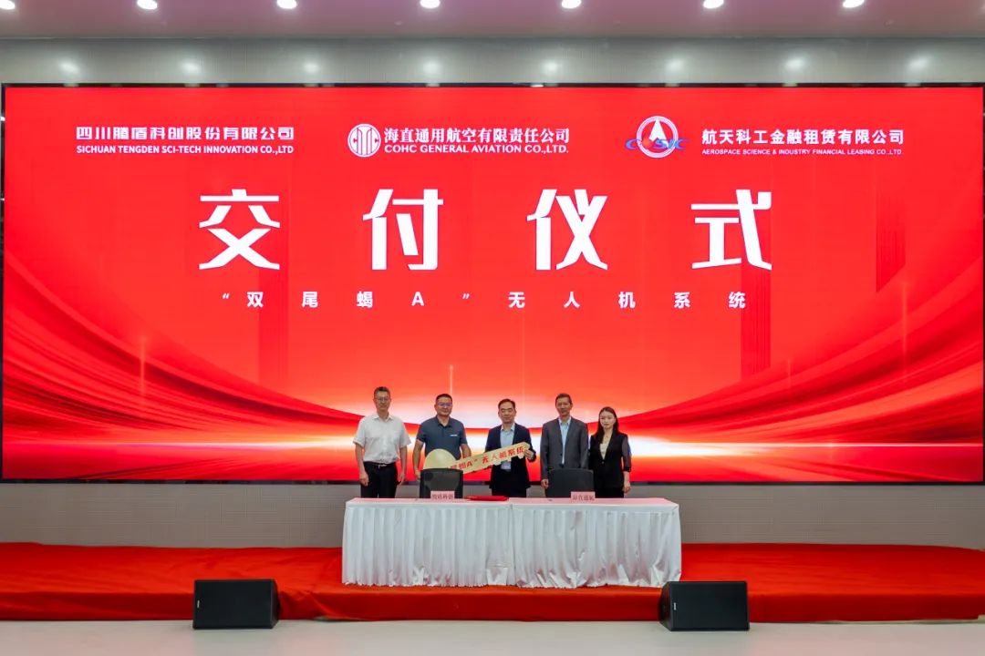 5月18日,四川腾盾科创股份有限公司(以下简称“腾盾科创”)在自贡生产试飞中心举行人影专用型“双尾蝎A”无人机系统批量化交付仪式,向海直通用航空有限责任公司(以下简称“海直通航”)移交该型无人机系统,航天科工金融租赁有限公司(以下简称“航天金租”)作为重要合作伙伴出席仪式,共同见证低空经济规模化发展的重要节点。此次交付不仅是腾盾科创技术实力的展现,更是落实低空经济战略部署的关键实践,为“新质生产力”在气象服务领域的深化应用提供核心装备支撑。
