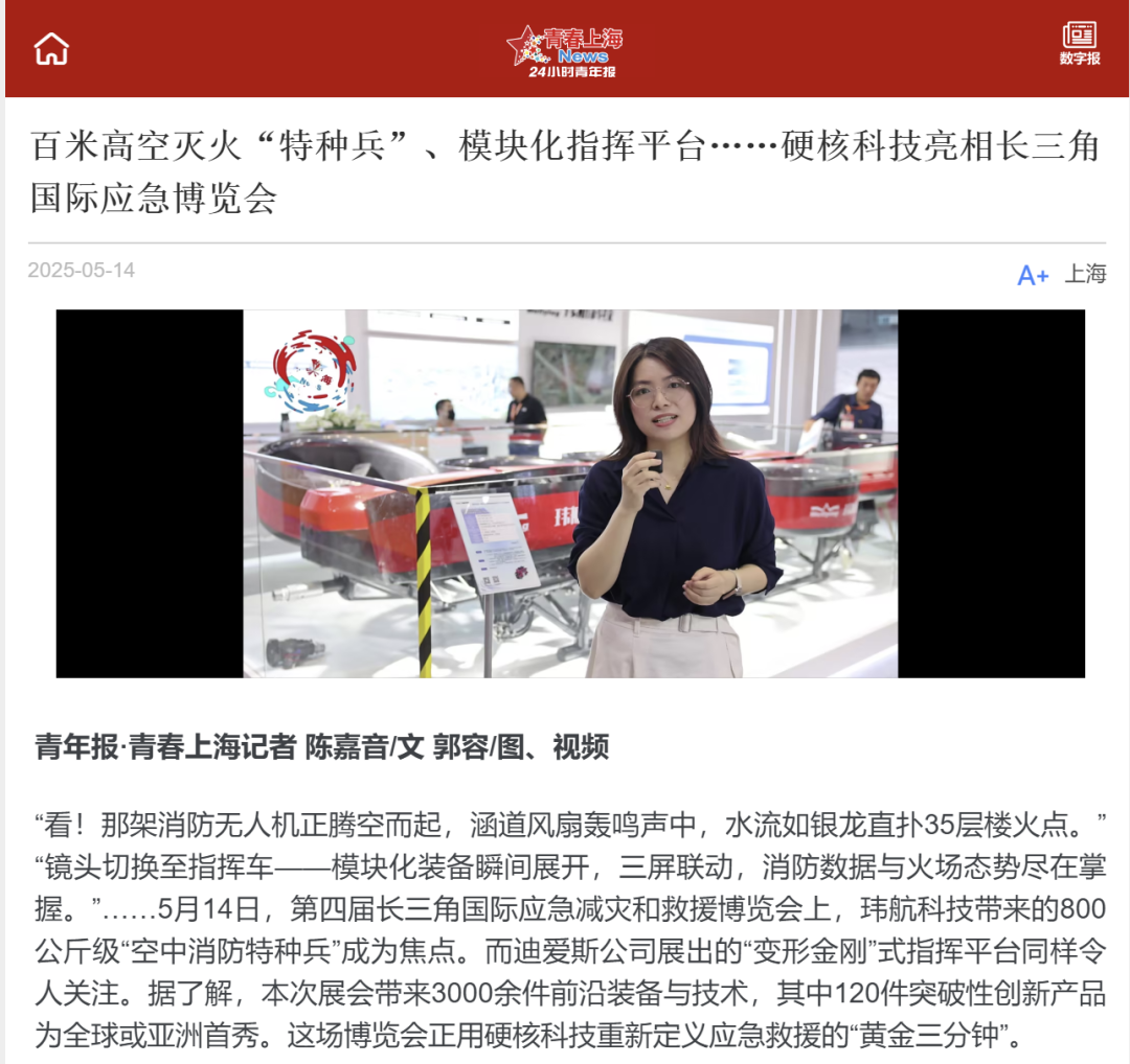 展会期间,玮航科技的创新成果引发媒体矩阵式报道。新华网、中新网、解放日报等多家权威媒体以头版和重点报道等形式集中点赞玮航主战灭火无人机系统“填补城市高层主战灭火领域技术空白”的革命性突破,评价其为“空中消防特种兵”、“空中消防栓”,持久而广泛的媒体影响力印证了这款产品从专业认可到社会价值的多维突破。正如回答新华社记者提问时张磊所言:“我们认为应急救援领域承担了更大的责任,是人们日益增长的幸福生活的迫切需求,和存在的公共安全隐患之间的矛盾;随着科技进步,应急救援领域也要实现快速的无人化和智能化,我们在各行各业都看到了这样的趋势,新质生产力在提高人民生活质量的同时,也给应急救援的发展提出了新的任务和难题,而这也需要通过新质生产力提升我们的应急救援装备来解决这些难题。”