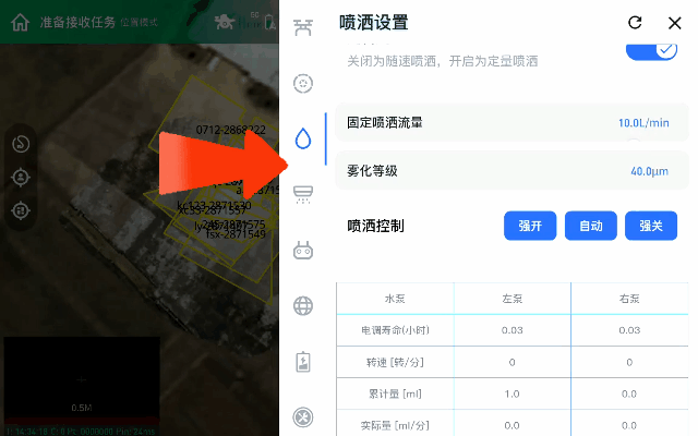 在开启强喷前,可以设置强喷亩用量及雾滴粒径。