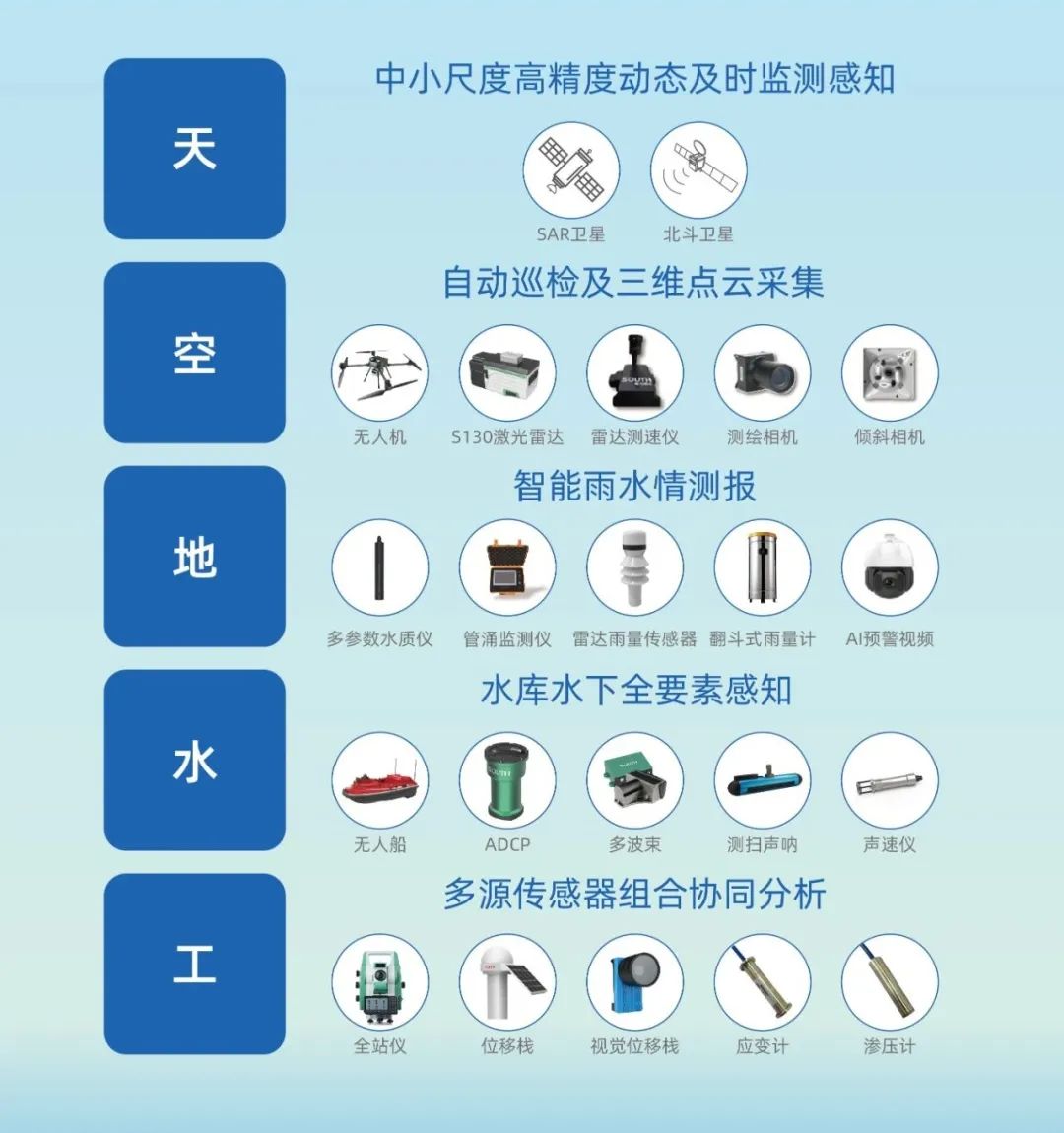 南方测绘“天空地水工”一体化监测感知体系,通过集成卫星遥感、北斗导航、无人机巡检、地面自动监测站、水下探测设备等多种监测手段,结合先进的数据处理与分析算法,全天候、全方位获取水利全要素,助力水库大坝安全监测、雨水情“三道防线”建设、水利工程建设等。装备一览