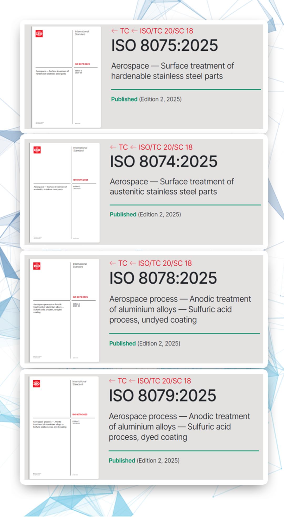 近日,由中国航空工业集团在国际标准化组织航空航天器技术委员会材料分技术委员会(ISO/TC20/SC18)牵头研制的ISO 8074《航空航天-奥氏体不锈钢零件表面处理》、ISO 8075《航空航天-沉淀硬化不锈钢零件表面处理》、ISO 8078《航空航天-铝合金阳极处理-硫酸工艺,未染色涂层》、ISO 8079《航空航天-铝合金阳极处理-硫酸工艺,染色涂层》等4项国际标准正式发布。这4项国际标准将进一步优化铝合金和不锈钢表面处理工艺技术,确保零件表面处理质量的一致性,从而增强航空航天装备的抗腐蚀抗氧化性能,推动全球航空航天器绿色制造关键技术的研发和产业化,提升航空航天装备质量。