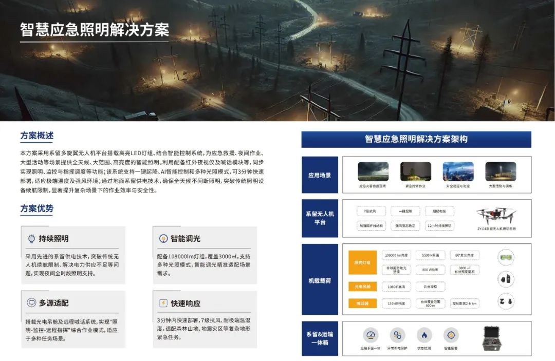 该方案采用ZY-E4系留多旋翼无人机平台搭载高亮LED灯组、结合智能控制系统,为应急救援、夜间作业等场景提供全天候、大范围、高亮度的智能照明,解决了传统照明设备在复杂地形中易倾倒、覆盖范围不足的痛点。