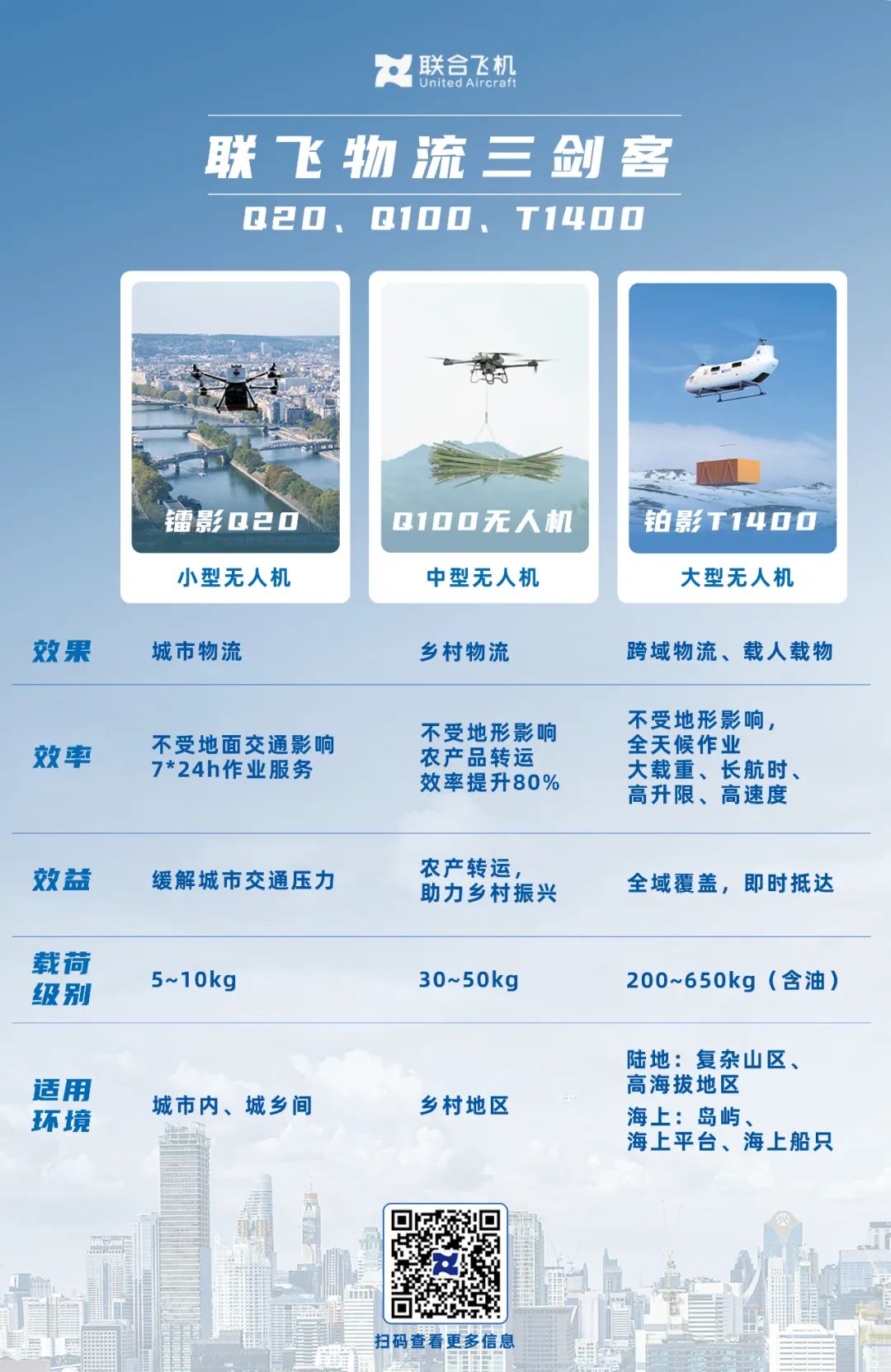 联合飞机构建「物流三剑客」低空物流运输方案,集合“大-中-小”型无人机的独特优势,覆盖“远-中-短”距离,可根据需求匹配5公斤至500公斤不等的物资载荷,不仅助力城市物流配送,更完善了城县乡村多层级物流体系,补齐传统陆运与空运之间的空白。
