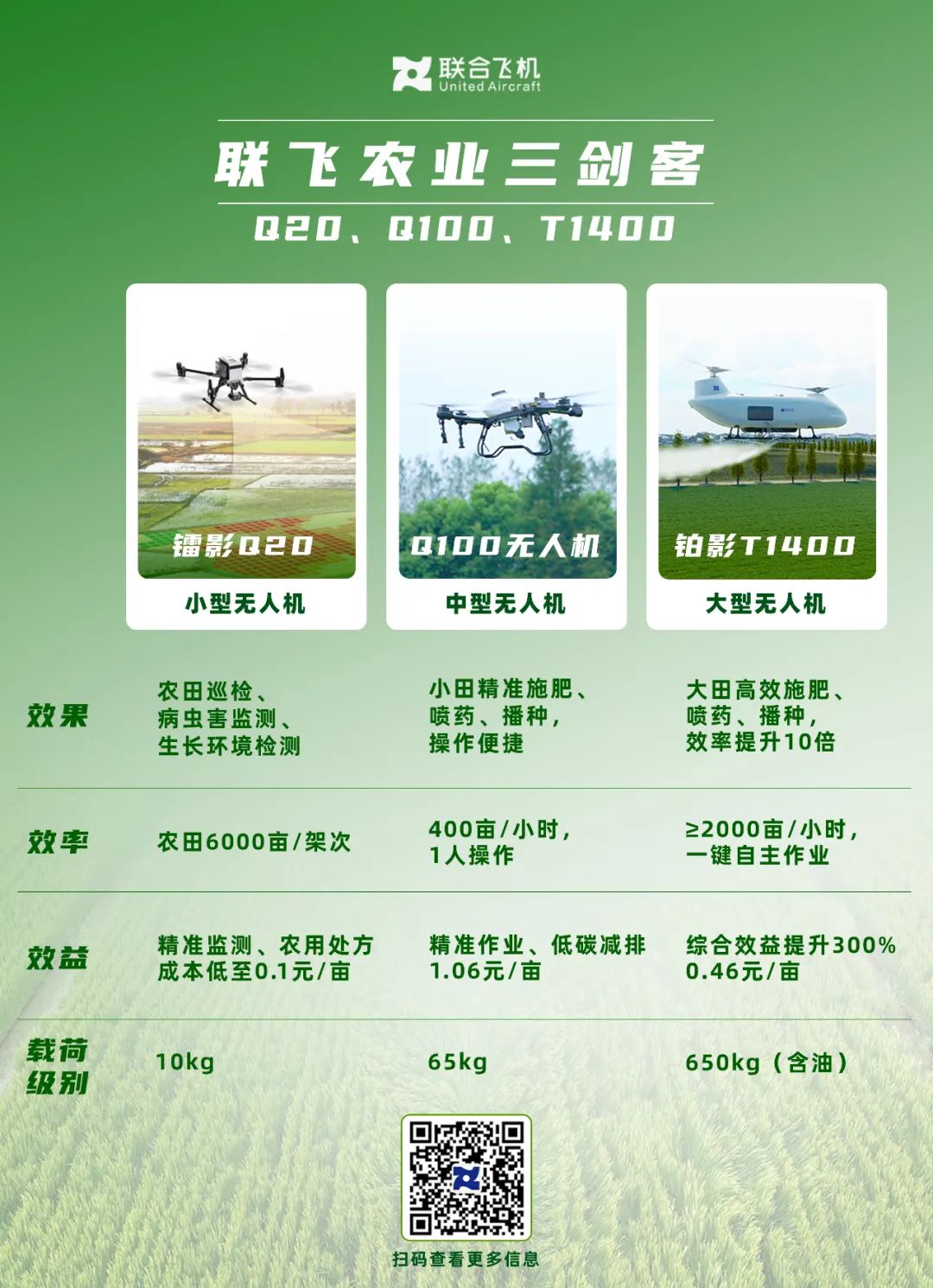联合飞机创新性地将大载重无人直升机的技术优势应用于农业领域,推出首款重载农业无人机「铂影」T1400。该机型可搭载农药喷洒、播种等系统,专为大田高效植保设计。其超大载荷能力彻底解决了传统农业无人机载重小、频繁换药的行业痛点,作业效率惊人,可达≥2000亩/小时,综合经济效益提升300%,为规模化农业带来革命性降本增效。同时,联合飞机提供轻量级Q100农业无人机,支持单人便捷操作,特别适用于中小规模农田及复杂地形区域的精准植保需求,进一步完善了农业无人机产品矩阵。