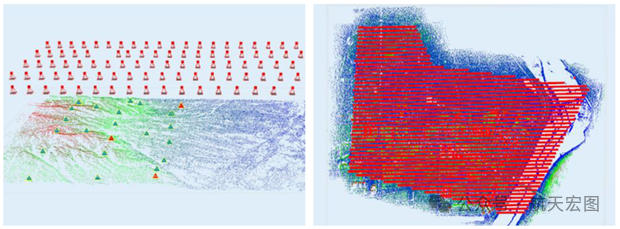 (左)相机位姿估计 ,(右)航线与3D点云重建结果