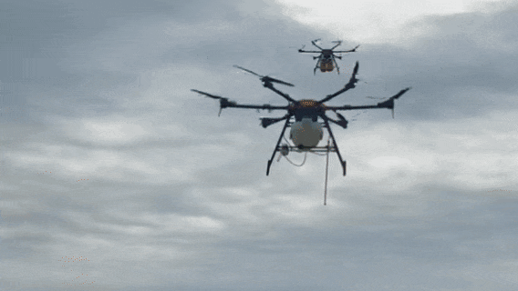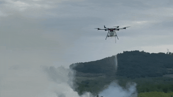 精准火力压制(快速破局):模拟火场点火后,首架ZMD60挂载2枚高效灭火弹,凭借其强大的飞行性能和精准的定位能力,迅速升空,抵近模拟火源核心区。在高空中悬停后快速锁定火源,精准投掷,灭火弹空中爆破喷洒瞬间覆盖火场,干粉弥漫形成窒息隔离带,高效阻断初期火势蔓延,精准压制火情,解决了“打早”难题。