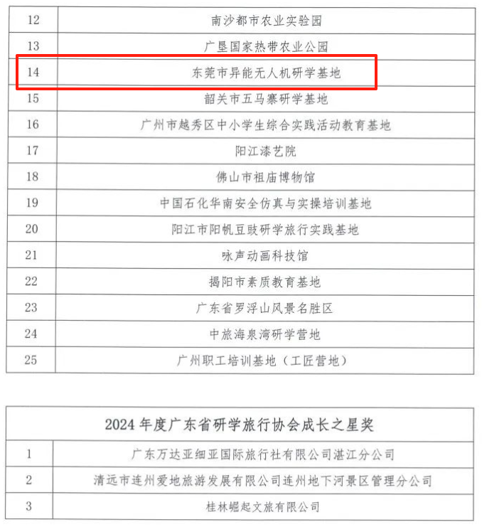 荣获 “2024 年广东省研学旅行协会优秀研学目的地” 这一殊荣,东莞市异能无人机研学基地深感荣幸。在此,我们向广东省研学旅行协会致以最诚挚的感谢!这不仅是对我们过往努力的高度认可,更是一份沉甸甸的责任,激励着我们不断前行。