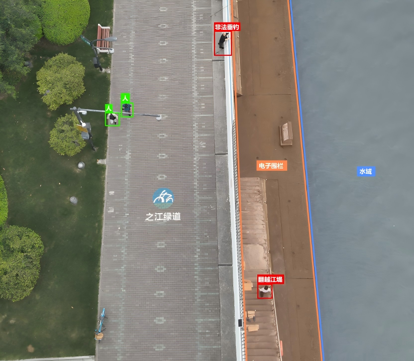 全域安全智能防控:AI视觉算法自动识别施工人员未佩戴安全帽/救生衣等违规行为(准确率>99%),实时定位落水人员位置(定位误差<1米),对非法捕鱼、危险水域游泳、非法垂钓等活动进行智能取证与喊话驱离,可减少70%人工干预。