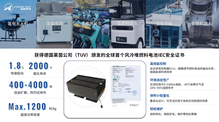 氢航科技以“先进氢能创造美好生活”为使命,坚持氢燃料电池系统研发为核心,充分发挥氢气作为高能量密度、零碳排放的清洁能源载体优势,深入探索温江区氢能无人机、氢能共享两轮车、氢能物流车、氢能游艇等领域的创新应用。氢航科技空冷型氢燃料电池已获全球首个德国莱茵IEC安全认证与上海检测中心强检认证,2023年6月与开云汽车通过工信部公告为唯一可以作为汽车动力的风冷堆燃料电池。