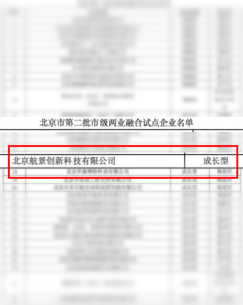 根据《北京市先进制造业和现代服务业融合示范园区和试点企业认定及支持办法 (试行)》规定,经组织申报、评选、公示等严格程序,航景创新在众多候选企业中脱颖而出成功入选。