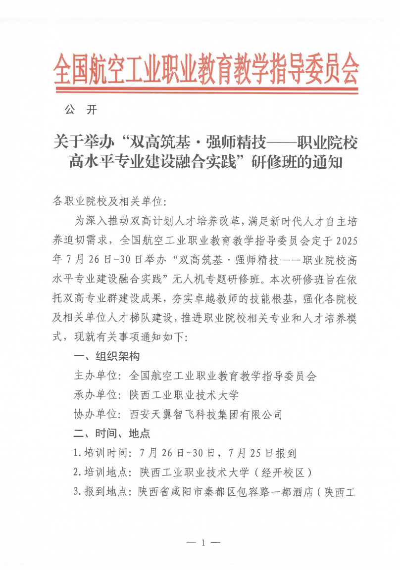 为深入推动低空经济背景下的无人机专业建设和人才培养,满足社会对低空行业人才的迫切需求,全国航空工业职业教育教学指导委员会定于2025年7月26日-30日举办“双高筑基·强师精技—职业院校高水平专业建设融合实践”专题研修班。本次研修班旨在依托双高专业群建设成果,夯实卓越教师的技能根基,强化各院校及相关单位人才梯队建设,推进职业院校相关专业和人才培养模式,现就有关事项通知如下: