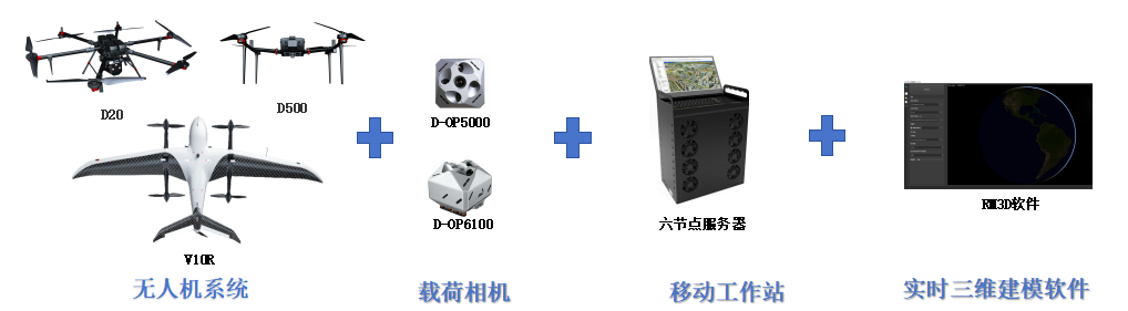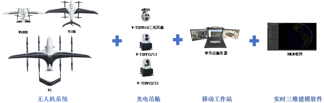 实时建模解决方案由无人机平台(V1/V10R/V500R/D20/D500)、载荷模块(V-TIRV12双光/V-TIRV22三光吊舱、D-OP5000/6100倾斜载荷等)、地面监管传输系统及实时建模终端四部分组成,实现“边飞行、边传输、边处理、边显示” 的闭环。