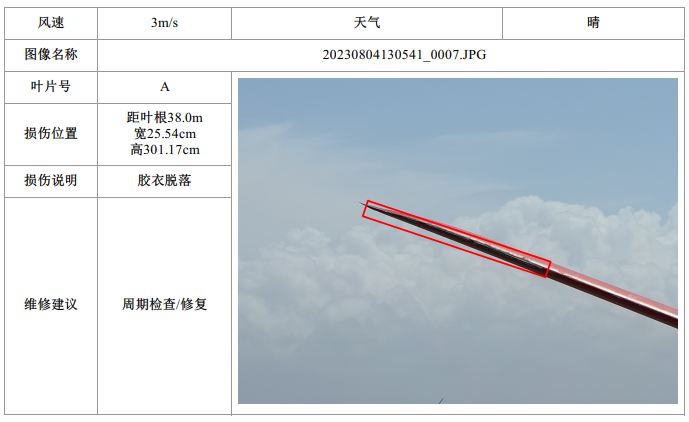 4.智能缺陷分析:在智能巡检管理系统上创建巡检任务,上传原始影像;系统自动分析缺陷类型和缺陷所在位置,生成缺陷报告,包括每个叶片的缺陷概况统计、缺陷的类别、缺陷的定位、缺陷的图像佐证,为运维人员提供消缺的依据。