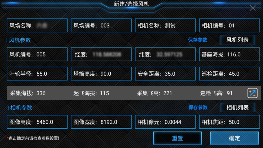 1.基础数据准备:需准备风机、相机的基础数据及飞行的基础参数,包括:风机中心经纬度坐标、风机轮毂中心高程、叶片尺寸、相元尺寸、相机焦距等,为后续智能计算提供完整数据支撑。
