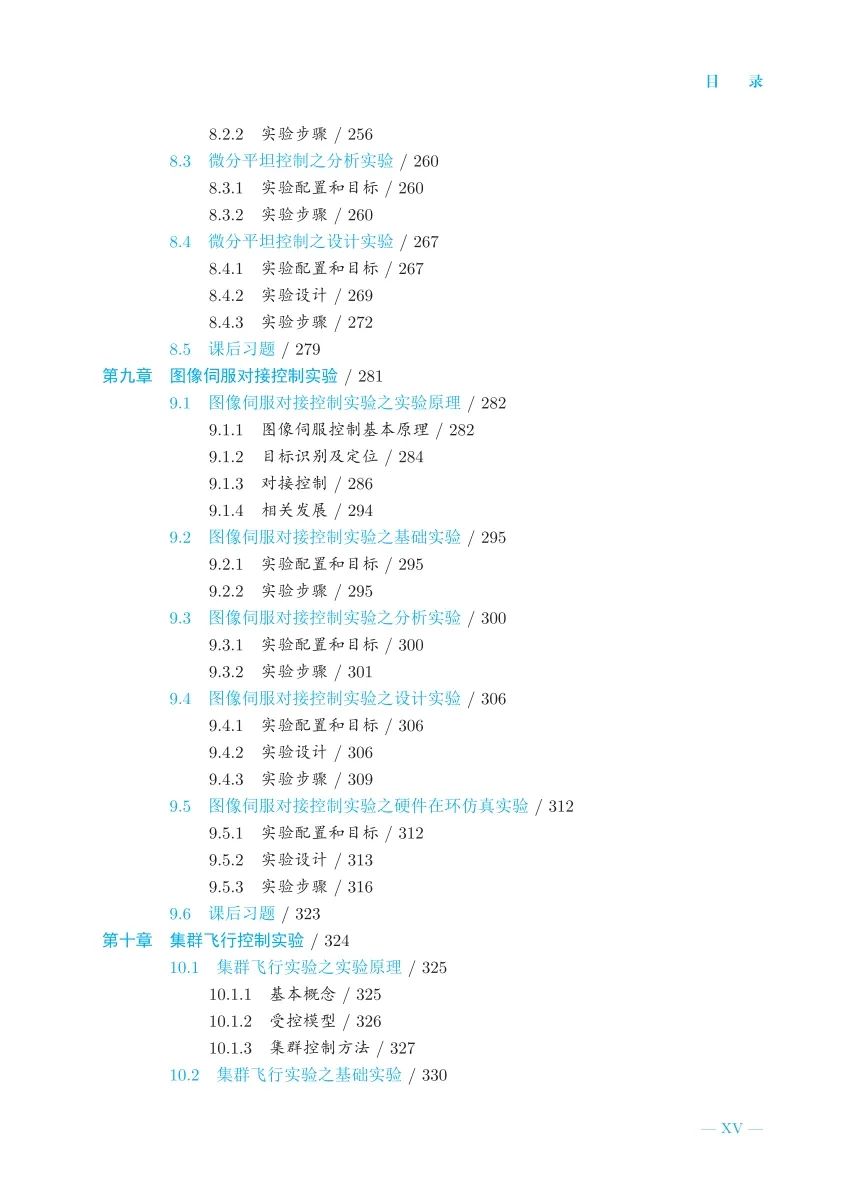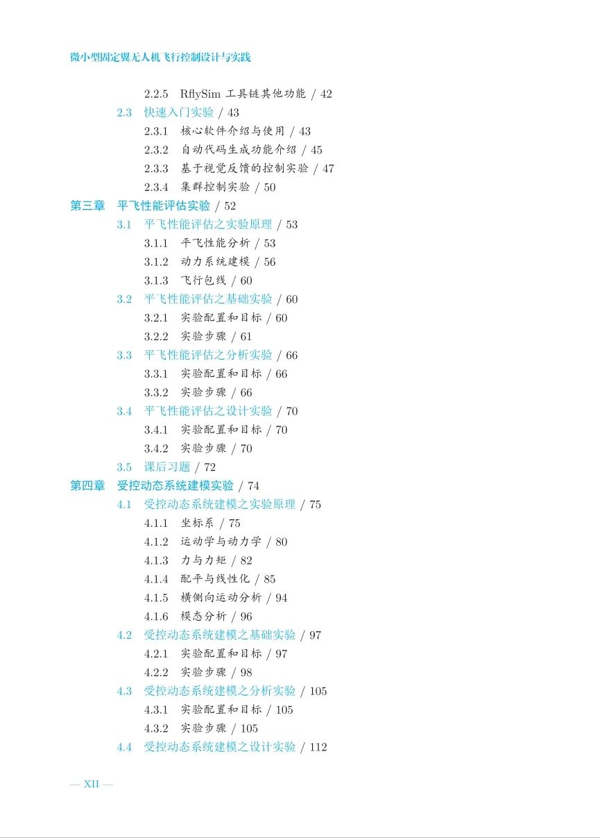 八个主题实验,涉及平飞性能评估实验、受控动态系统建模实验、系统辨识实验、底层飞行控制实验、路径跟随与规划实验、轨迹规划与微分平坦控制实验、图像伺服对接控制实验和集群飞行实验。每个实验都可以作为独立的案例。