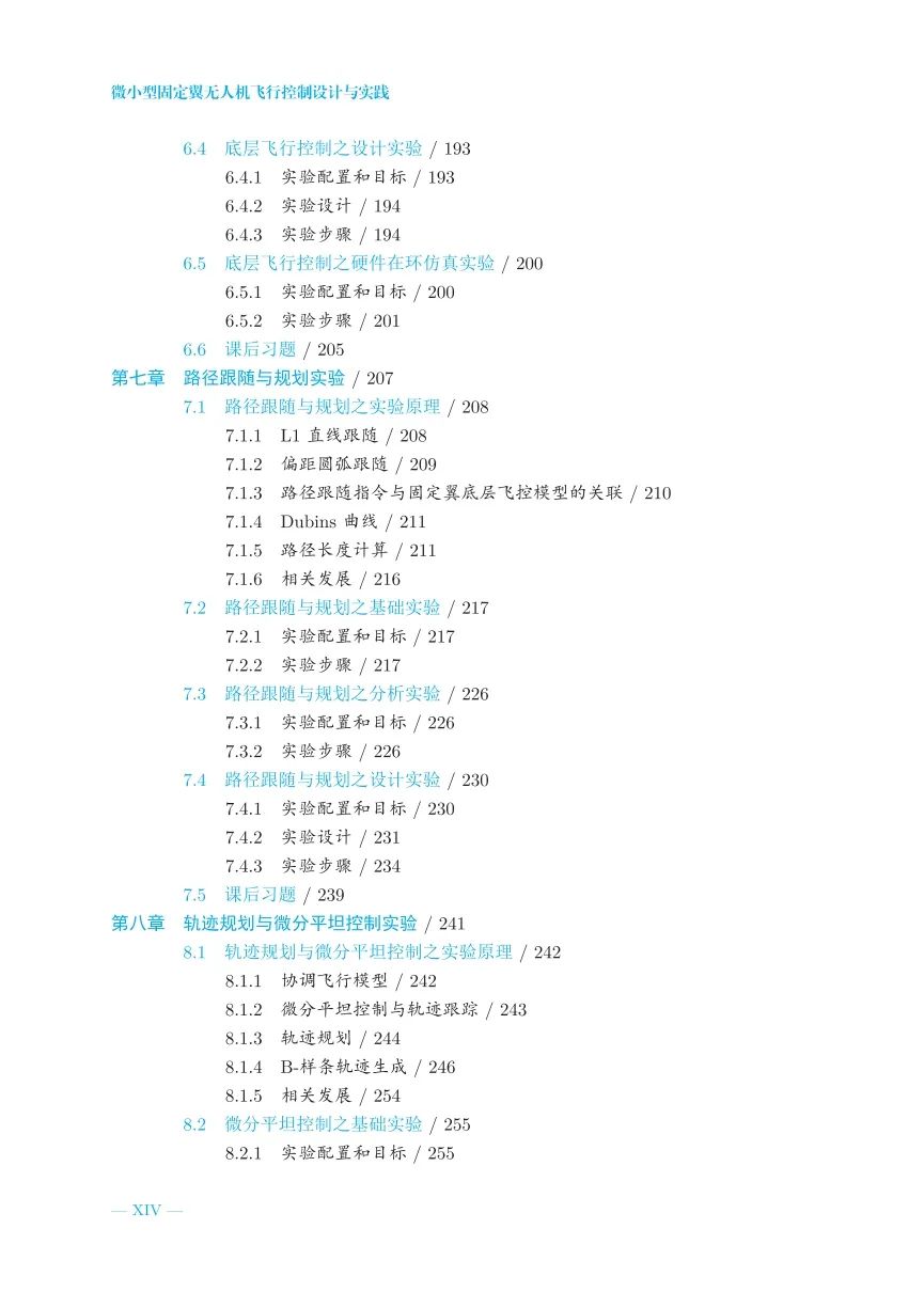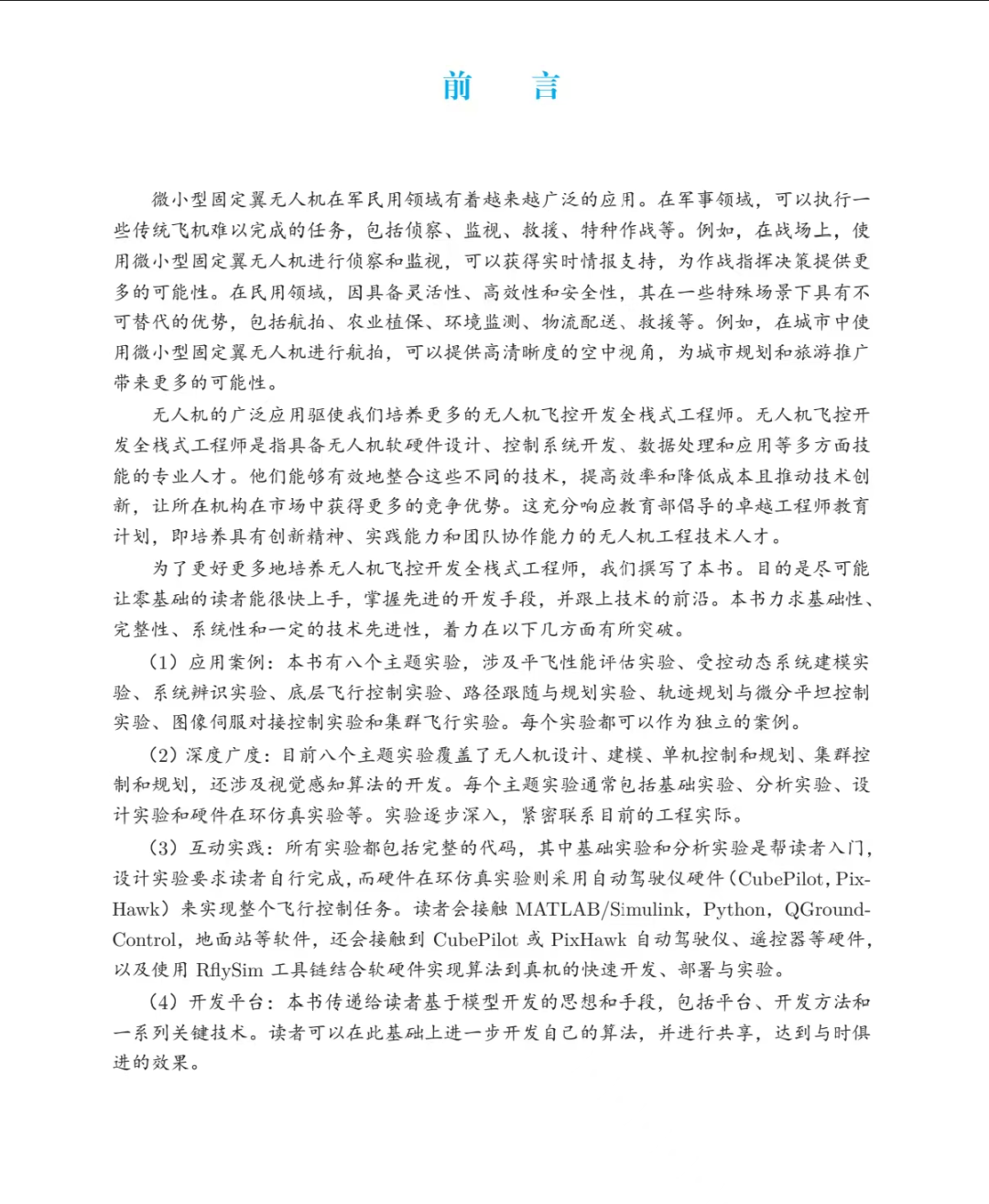 所有实验都包括完整的代码。读者会接触MATLAB/Simulink,Python,QGroundControl,地面站等软件,还会接触到CubePilot或PixHawk自动驾驶仪、遥控器等硬件,以及使用RflySim工具链结合软硬件实现算法到真机的快速开发、部署与实验。