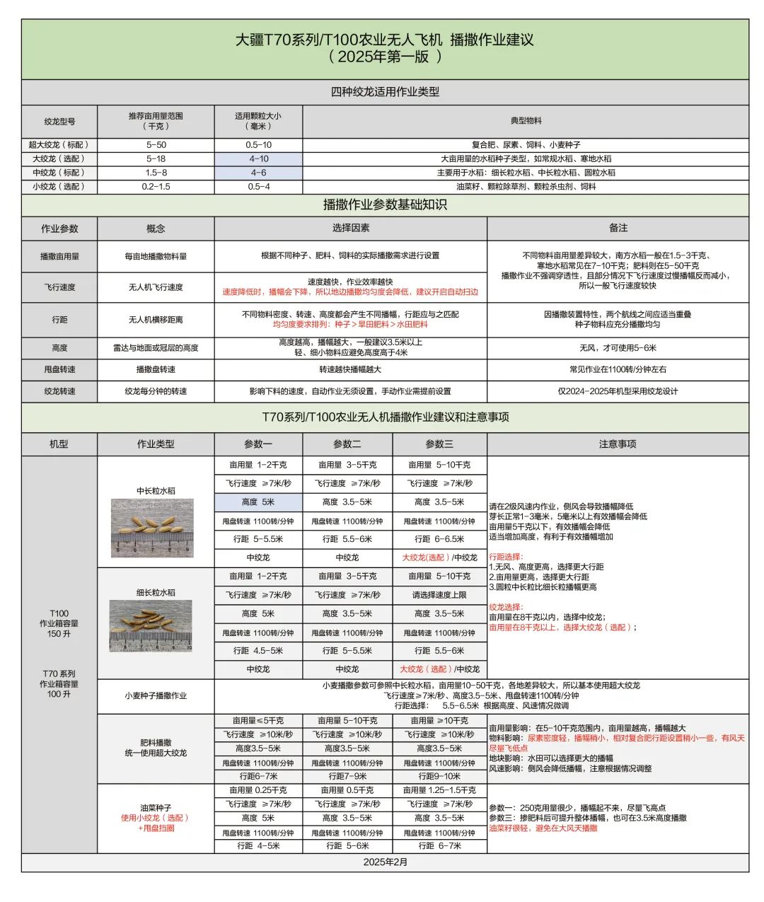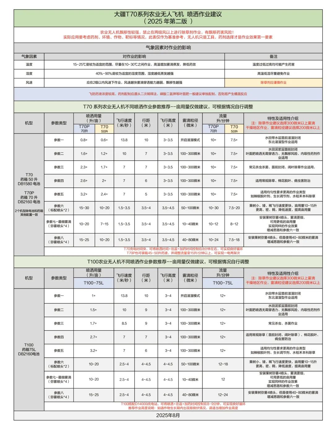 本作业建议以大疆农业 T70 系列和 T100 农业无人机为基础,结合部分作物、植保知识,最后整合成具有一定范围的作业参数建议,希望能够对各位农业无人机操作者有用。