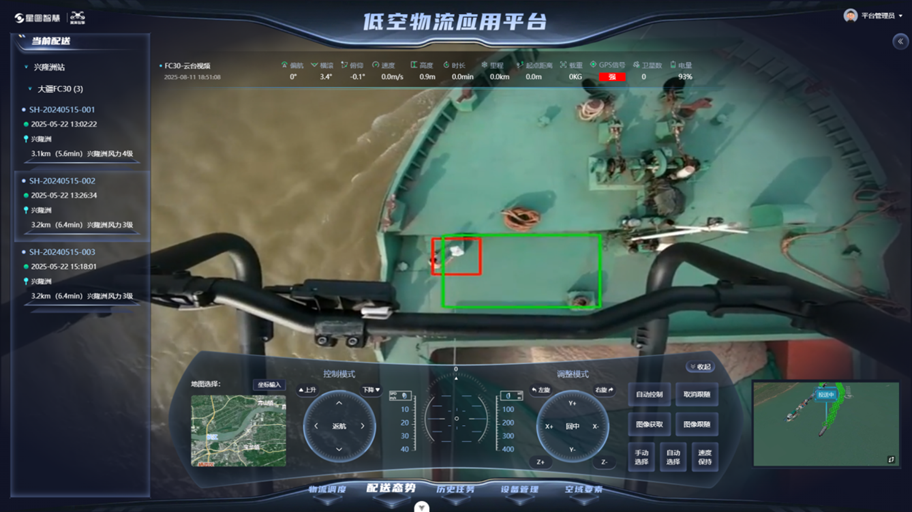 “江翼达” 低空飞行基地充分利用鼓楼滨江独特的区位与产业优势,与内河航运体系深度融合,拓展出多元应用场景,星图智慧低空物流应用平台成为全场焦点,该平台依托视觉AI与智能控制技术,实现对航行船舶的动态跟随与货物的无人化配送,展现出低空物流在水上场景的创新应用价值。