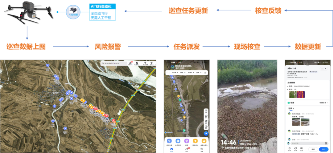 无人机可搭载可见光、热成像、多光谱等传感器采集河湖、水库及周边数据,进行无人值守的24小时自动化巡查,针对重点区域、重点目标支持定点打卡式巡查,结合AI模型开展河湖“四乱”监测,针对非法船只、钓鱼、游泳等非法侵入事件进行智能识别、告警和驱离。