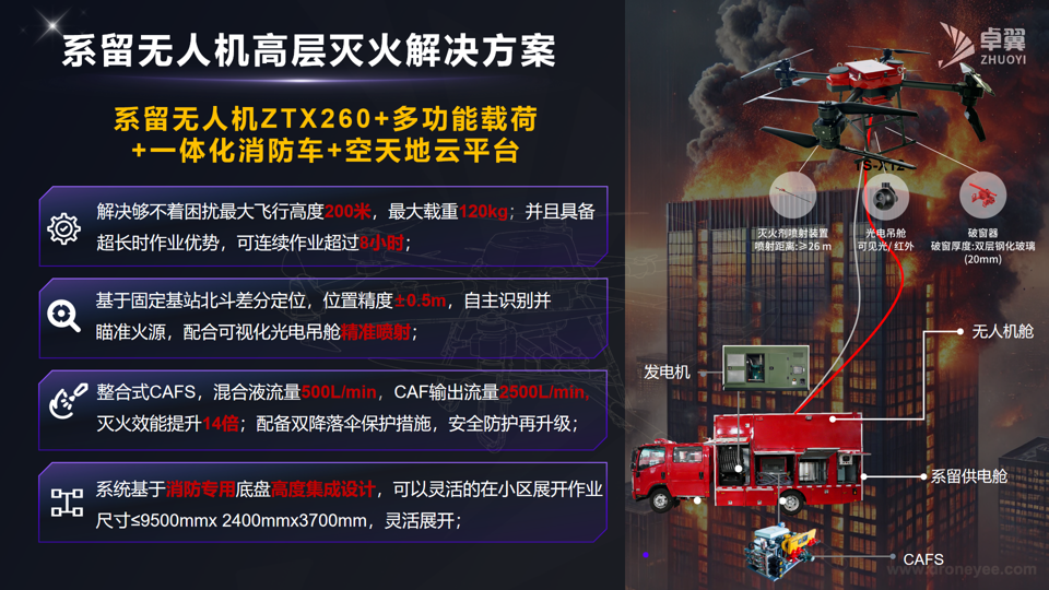 随着城市天际线不断攀升,高层建筑火灾扑救与人员安全疏散,正持续升级为全球性公共安全挑战。然而,传统消防系统存在“够不着、展不开、打不准、难度大”的痛点难题,一旦救援过程中遭遇电力中断、通道堵塞等极端情况,高层火灾救援的有效实施便面临严峻挑战。卓翼智能以其自主研发的新一代“ZTX260系留无人机高层建筑灭火系统”为核心,提出系留无人机高层灭火解决方案:系留无人机ZTX260+多功能载荷+一体化消防车+空天地云平台。该系统依托无人机平台的高稳定性、长续航时间和强负载能力,能够在确保飞行安全的前提下,快速响应并高效完成高空灭火任务。