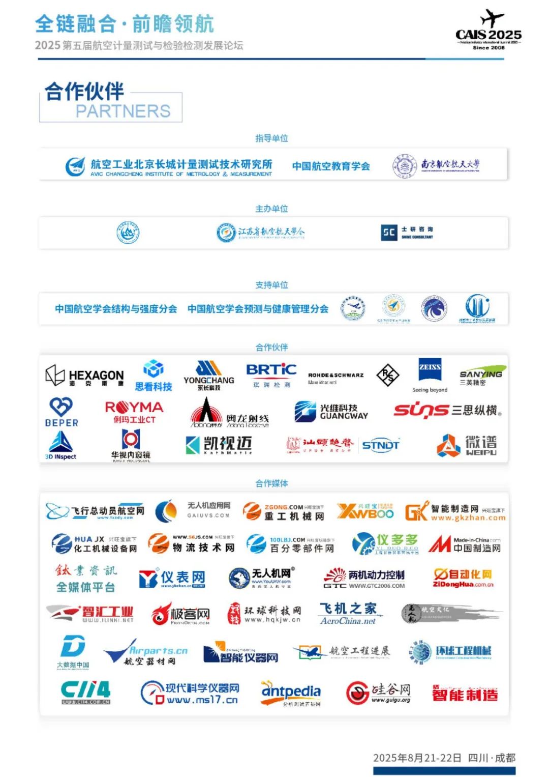 商用航空发动机计量需求与思考 滕跃飞,中国航发商用航空发动机有限责任公司理化计量部,副部长 数字成像检测与缺陷智能评定技术研究及应用 航空智能制造与检测技术发展 黄沙,海克斯康航空研究院方案技术总监 航空复材结构超声三维扫描计量检测的智能化升级与应用前瞻 刘松平,中国航空制造技术研究院,中航工业复合材料技术中心研究员 从三到五升级、从一到零深挖,测量技术赋能高性能航空制造 常智勇,北工业大学机电学院副院长,教授 12:00-13:30 午餐交流与观展 8月21日 下午 版块二:前瞻性计量检测技术引领国际航空未来 嘉宾主持 柔性多模传感技术突破:航空热环境参量监测新范式 飞秒光频梳技术及其在计量检测中的应用 航空热加工设备计量保障数字化系统研发与应用 先进检测技术在航空发动机特型零件数字化检测应用 袁园,中国航发南方工业有限公司 ,某型发动机总计量师,研究员 14:50-15:10 茶歇交流与观展 数智化试飞测试技术发展与趋势 王伟,时任中航工业沈飞公司试飞副总师。中国商飞公司C919大型客机型号副总设计师,试飞中心党委委员,总工程师,中国商飞公司三级专家 构建下一代航空智能计量测试与检验检测解决方案的探索与实践 李富强,中国航发西安动力控制科技有限公司,检验检测中心副主任 航空发动机数字化检测系统平台建设探索与实践 李旭,中国航发成都发动机有限公司,检验检测中心,主管工艺师 机器视觉在飞机结构损伤原位检测中的应用进展 【圆桌交流】破壁技术到场景:先进测量技术如何重塑航空计量检测全链条 参与嘉宾: 黄沙,海克斯康航空研究院方案技术总监 李富强,中国航发西安动力控制科技有限公司检验检测中心副主任 沈毅君,上海交通大学机械与动力工程学院助理研究员 颜荣,中国航发四川燃气涡轮研究院计量检验技术中心计量技术室副主任 8月22日 上午 版块三: 全寿命周期计量检测技术创新与应用 嘉宾主持 赵涌,四川燃气涡轮研究院,研究员 航空发动机叶片类复杂零部件精密测量与计量技术研究与应用 何小妹,北京长城计量测试技术研究所,长度研究部精密仪器实验室主任,几何量测试计量技术专业总师 航空材料测试关键技术研究与应用 熊俊,航空工业成都飞机工业(集团)有限责任公司,理化实验室主任,高级工程师 叶片表面缺陷智能化检测技术研究 曾德强,中国航发贵州黎阳航空动力有限公司,高级工程师,历任计量处处长计量检测中心主任,质量工程部部长,检验检测事业部总经理,现任一级技术专家,上海交大特聘专业学位硕士研究生行业导师 三维扫描技术在航空航天中的应用 王平,思看科技(杭州)股份有限公司,国内销售部西南总监 10:20-10:40茶歇交流与观展 发动机用陶瓷基复合材料力学性能测试与表征 何玉怀,北京航空材料研究院,检测研究中心主任 发动机主要性能测试参数动态校准技术 赵涌,四川燃气涡轮研究院,研究员 引擎之心:航空发动机全生命周期型号计量体系构建思考 梁洁,中国航发湖南动力机械研究所,质量与体系管理部主任 11:40-13:30 午餐交流与观展 三坐标测量设备的误差补偿技术分析 谭本能,中航工业北京航空精密机械研究所研究员 线缆静电起电与防护技术研究 李代勇,中国电子科技集团公司第十研究所,高级工程师 航空零部件加工过程中的在机干耦合测厚技术 沈毅君,上海交通大学,机械与动力工程学院助理研究员 无损检测在民航维修中的应用和民航无损检测标准体系建设 胡小虎,中国国际航空公司北京飞机维修工程有限公司无损检测主任工程师 15:30 大会结束 展商风采 现场掠影 大会主办单位 上海士研管理咨询有限公司成立于2005年,致力于为组织领导者提供沟通交流与专家智库平台。通过二十年沉淀与积累,覆盖了金融与投资、交通与运输、消费与文旅、医药与医疗、能源与资源、高科与电信、公用与政府等产业领域,服务着全球500强和万余家领导型企业,汇聚了百万余名机构决策者,并与千余家产业权威机构建立了战略伙伴关系。士研咨询秉承专业立身的理念发展队伍,现拥有百余名专业的资深人员,核心管理团队都具有十五年以上的专业经验。