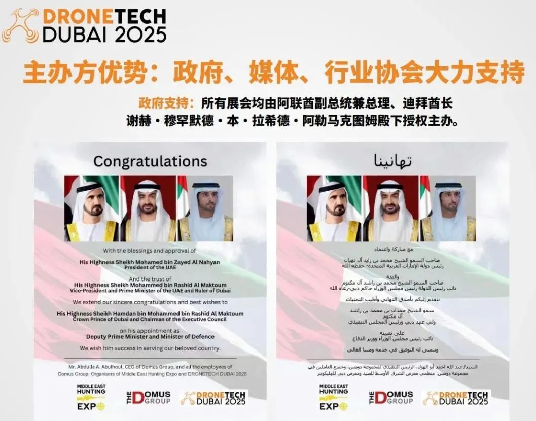 凭借在迪拜及中东地区政商企界长期积累的深厚行业资源与人脉网络,以及中阿关系合作40年后进一步深化;如今的中国制造产品在中东已是高性价比、安全优质产品的代名词,中企出海中东已是热潮,为引入更多优质中国企业产品和技术到迪拜。借助迪拜作为中东科技枢纽的地位,展会为中外企业提供高效对接平台,助力产业国际化布局与落地合作。2025迪拜国际低空经济博览会暨世界无人机展将成为中企出海新契机,同时为中东及世界低空经济市场消费者、制造商和投资者提供一个行业最新产品和技术展示交流的平台,显著促进行业创新和商贸合作!