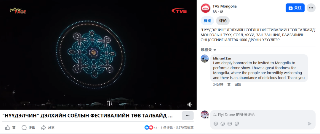 蒙古国副总理阿玛尔赛汗在其社交账号上点赞并转发一飞智控的无人机表演,该动态阅读量突破23万+。