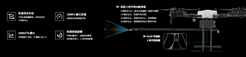 D15R 清洁无人机模块化设计,可适配两种不同的清洗挂载,有固定式、摆动式喷头,两种不同角度的喷嘴设计满足多样清洗需求,为行业提供便捷高效、多场景适用的空中高压清洗作业解决方案,可广泛应用于大厦外墙、光伏板、高塔等高空清洁场景。