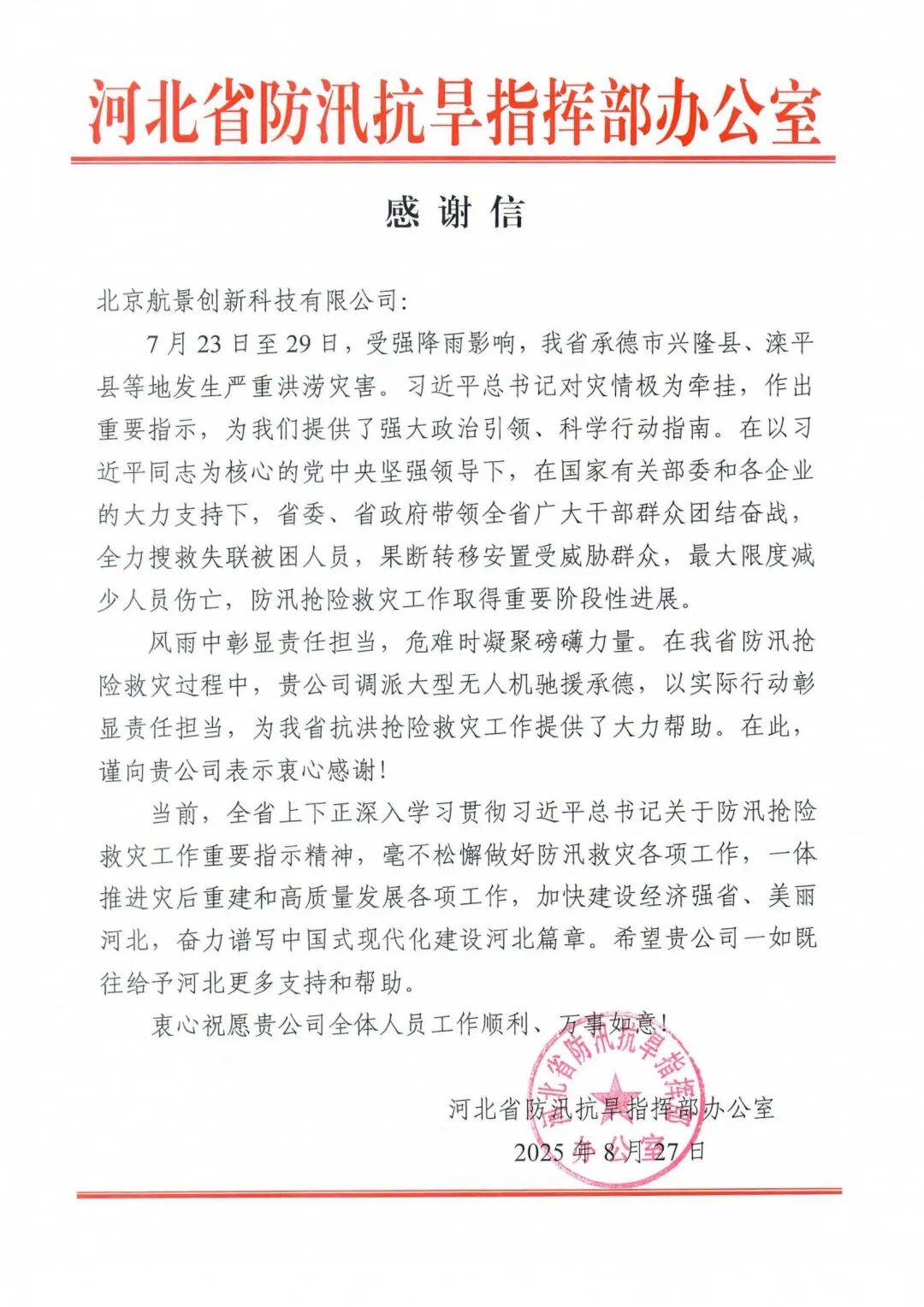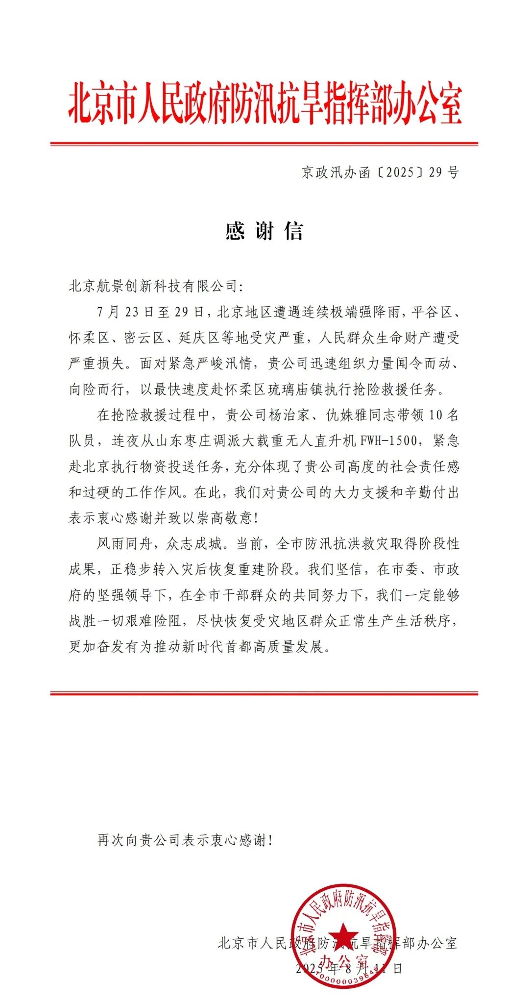 今年,面对北京、河北的暴雨灾害,航景创新连夜调派FWH-1500重载无人直升机紧急驰援灾区,积极参与汛期救援工作,获两地防汛抗旱指挥部高度表彰。