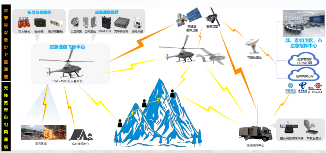 航景创新无人机飞行平台可搭载卫通、公网基站、PDT、自组网等设备,为地面救援人员及应急指挥部建立稳定的通信链路,大幅提升应急指挥能力。