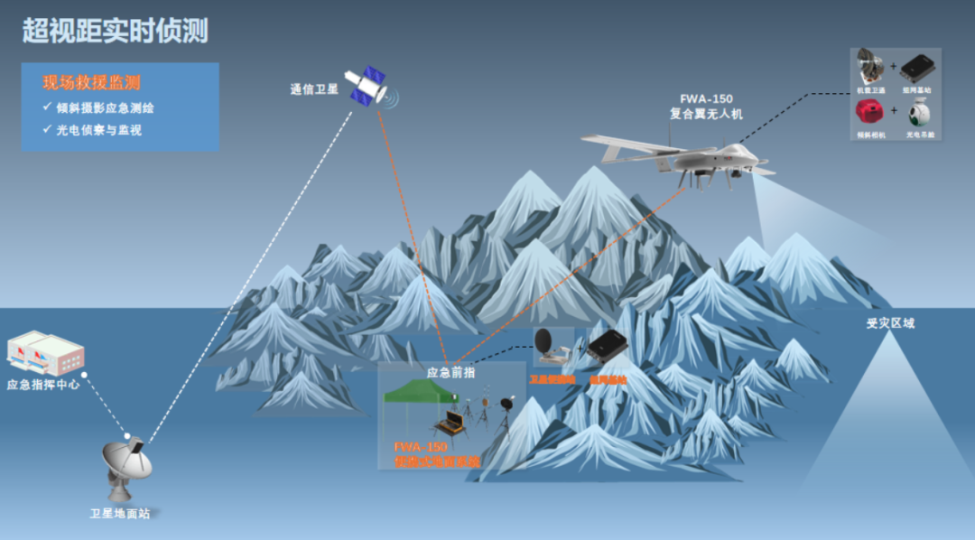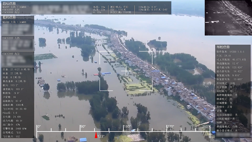 灾情发生时,无人机飞行平台可搭载光电吊舱及时获取受灾地区的影像数据,并通过卫星或网连模组通过公网的形式将实时影像数据回传至云平台。这时指挥人员便可通过云平台回传回来的视频实时快速地查看到受灾地区的现场情况,从而合理安排救灾资源。