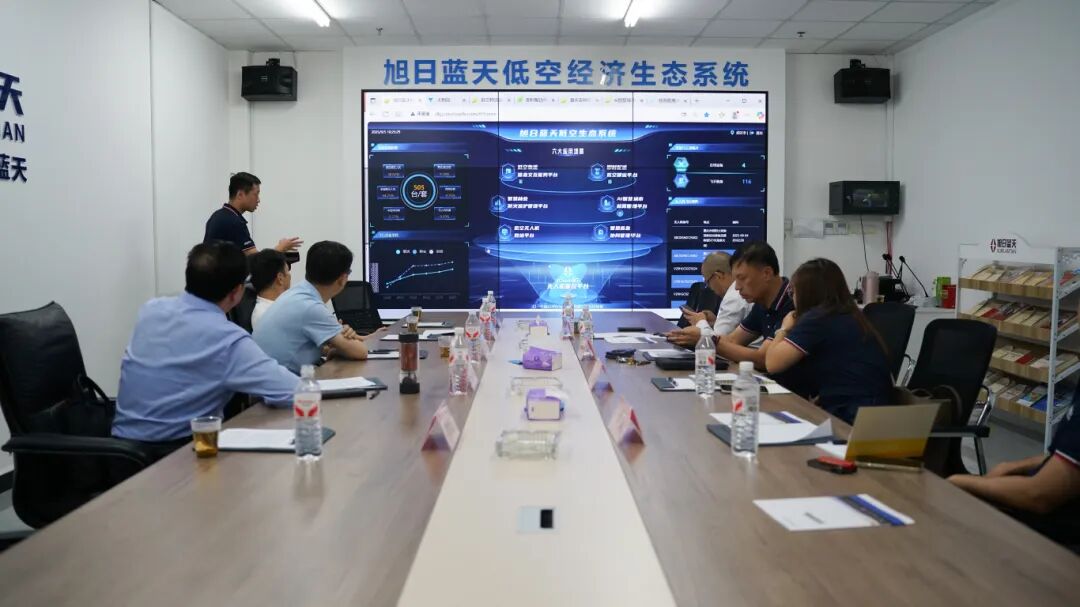 旭日蓝天总经理王军也向考察团详细介绍了在低空经济相关技术研发、业务布局等情况。期间,团队重点展示了旭日蓝天低空生态系统平台,该平台整合了运营监控、数据分析等多项功能,通过智能化手段实现对低空资源的高效利用和安全管控。