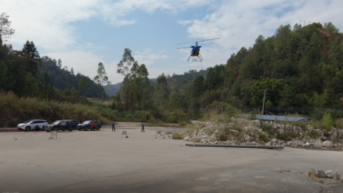 2024年8月27日,应南方电网广东韶关乐昌供电局需求,联合团队在广东省乐昌市开展首次实战。犇腾600无人机航运及吊装235kg(相当于4名成年人重量)的10千伏电杆,从平地运输至山顶(航程约1500米),在无人机操作人员与地面辅助人员的协同下,精准完成电杆插入杆洞作业。无人机撤离后,地面人员迅速完成扶正与余土回填,整个过程高效流畅,最大限度减少了传统机械对农作物的损伤及青苗赔偿,为复杂地形施工提供了全新解决方案。