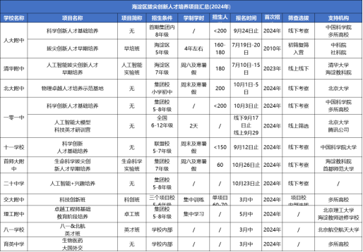 “拔尖创新人才计划”:各高校通过各种途径选拔并培养科技创新人才。在科学领域表现突出的学生将有更多的机会接受深入培养,目前海淀:人大附中、清华附中、北大附中、一零一中学、十一学校、首师大附中、二十中学、交大附中、理工附中、八一学校、育英中学等多所学校发布科技拔尖人才培养计划